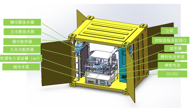 燃料電池電源系統采用撬裝式設計,主要包括燃料電池發電模塊、熱管理以及電源管理模塊,根據功率需求燃料電池電源系統由一個至多個發電集裝箱組成,提升運輸便利性,滿足高功率等級應急用電需求。同時引入了直流母線并網概念,燃料電池電源等發電單元以及儲能裝置均通過電力變換器裝置接入直流母線,直接向直流負載供電或者通過逆變器連接至交流電網或交流負載。大大減少了直流分布式電源和負載接入電網所需的換流設備,在降低成本的基礎上提高了電能的利用效率,同時還具備分布置電源和負荷配置靈活的用電。